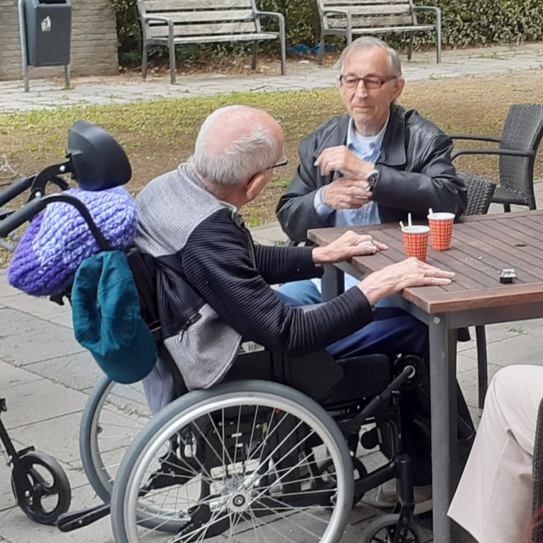 Dat het Buurtterras voor mooie ontmoetingen zorgde, staat vast. Zo liep Lambert, al langere tijd bewoner van Scharwyerveld, onverwachts een oude collega tegen het lijf. Tot hun verbazing bleek deze aan de overkant van de straat te wonen! De heren werkten vroeger samen in de keuken van het AZM en hadden tijdens het Buurtterras de kans om bij te praten onder het genot van een hapje en een drankje. Hopelijk zetten ze hun hernieuwde contact voort in de huiskamer van het buurtnetwerk binnen Scharwyerveld.