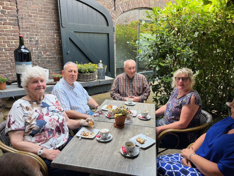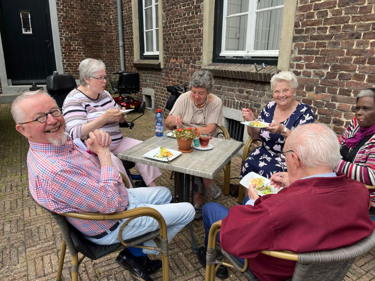 De dag had niet beter kunnen zijn. Een aangename temperatuur, zorgt ervoor dat er op de mooie historische binnenplaats van de Geleenhof genoeg te genieten valt. De bewoners laten zich de koffie, een stuk vlaai, een glaasje wijn en een kipcocktail goed smaken en zijn zeer te spreken over de gastvrije verzorging.